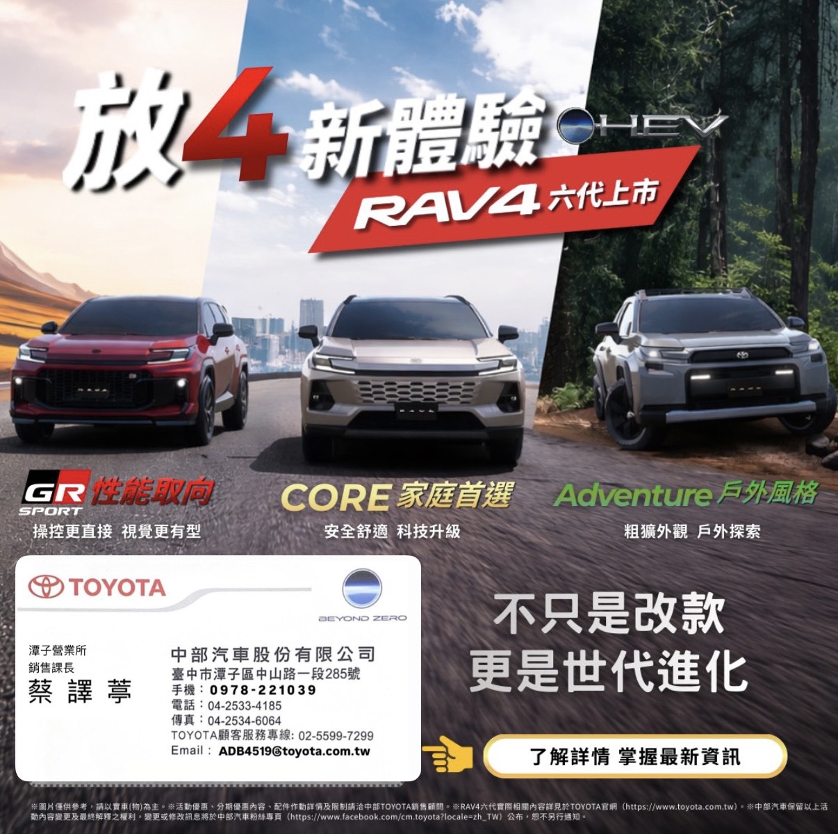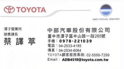 COROLLA CROSS 時尚的跨界SUV,兼具實用與舒適性 RAV4 堅固耐用的SUV,適合各種冒險需求 ALTIS 高效能的緊湊型轎車,適合城市通勤 TOWNACE 靈活的商用車,適合運輸和家庭使用 關於您的專屬銷售課長 蔡譯葶 您好,我是 Toyota 銷售課長 蔡譯葶 我在Toyota潭子營業所,以「最專業的服務,最誠懇的價格」來為您推薦購⾞計畫! 無論是新車選購、試駕體驗,或是售後服務,我都以客戶為中心,確保每位顧客都能享受到無憂且愉快的購車體驗。 誠摯期待與您相遇,讓我為您開啟全新的駕馭旅程! 歡迎來電或加⼊LINE洽詢~ 立即致電:0978-221-039加入LINE諮詢 用專業贏得信賴,用誠懇打動人心 TOYOTA以精準的操控性著稱,提供線性且順暢的加速力道,讓您在駕駛中體驗無與倫比的樂趣 無論是城市駕駛還是長途旅行,TOYOTA都能滿足您的需求 立即預約賞車 信賴首選 價格實在 預約試乘 提供各類型的TOYOTA新車,包括轎車、SUV、卡車等 金融服務 提供多種貸款方案,幫助客戶購車 售後服務 提供定期保養、維修服務,包括更換油液、檢查剎車系統等 立即致電:0978-221-039加入LINE諮詢 車款展示 預約試乘 COROLLA CROSS $79.9~98.9萬 RAV4 $101~138萬 ALTIS $72.5~88.5萬 TOWNACE $53.9~62.5萬 立即致電:0978-221-039車款詳細介紹 中部Toyota 潭子旗艦所 TOYOTA 潭子旗艦店持續打造專業團隊! 我們不只是賣車,而是創造專業價值 我們相信,讓新人發光,就是讓品牌發熱! 地址:台中市潭子區中山路一段285號 聯絡電話:04-2533-4185 營業時間:周一~周日 08:30–21:00
